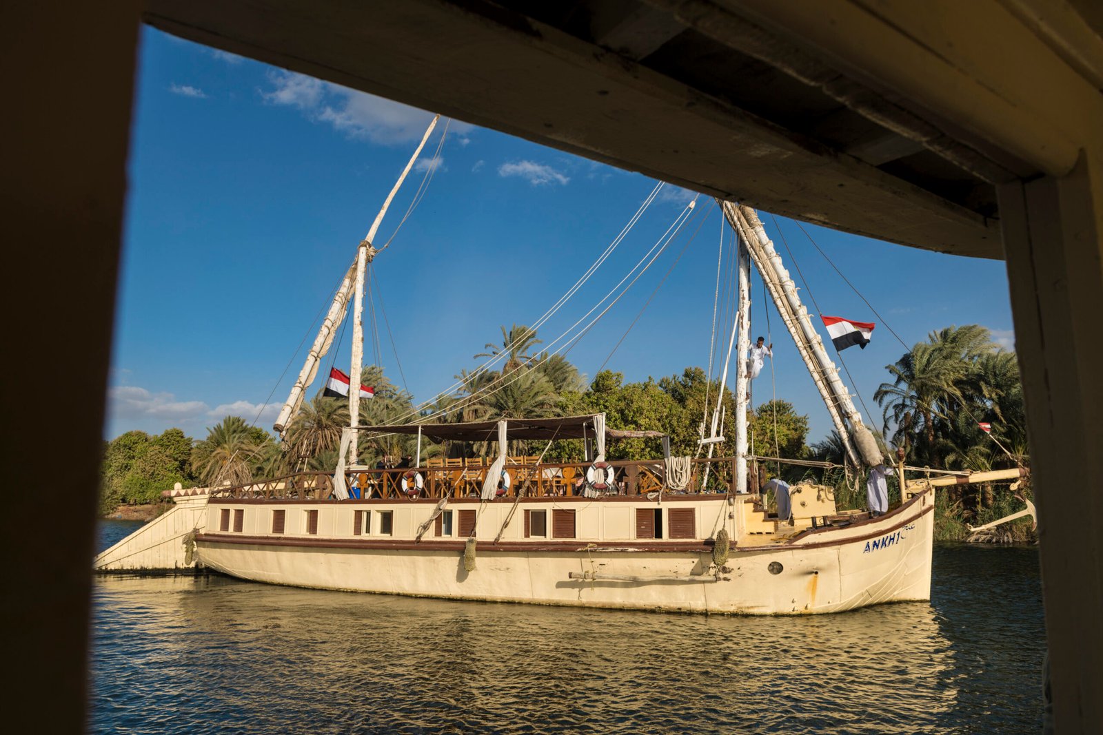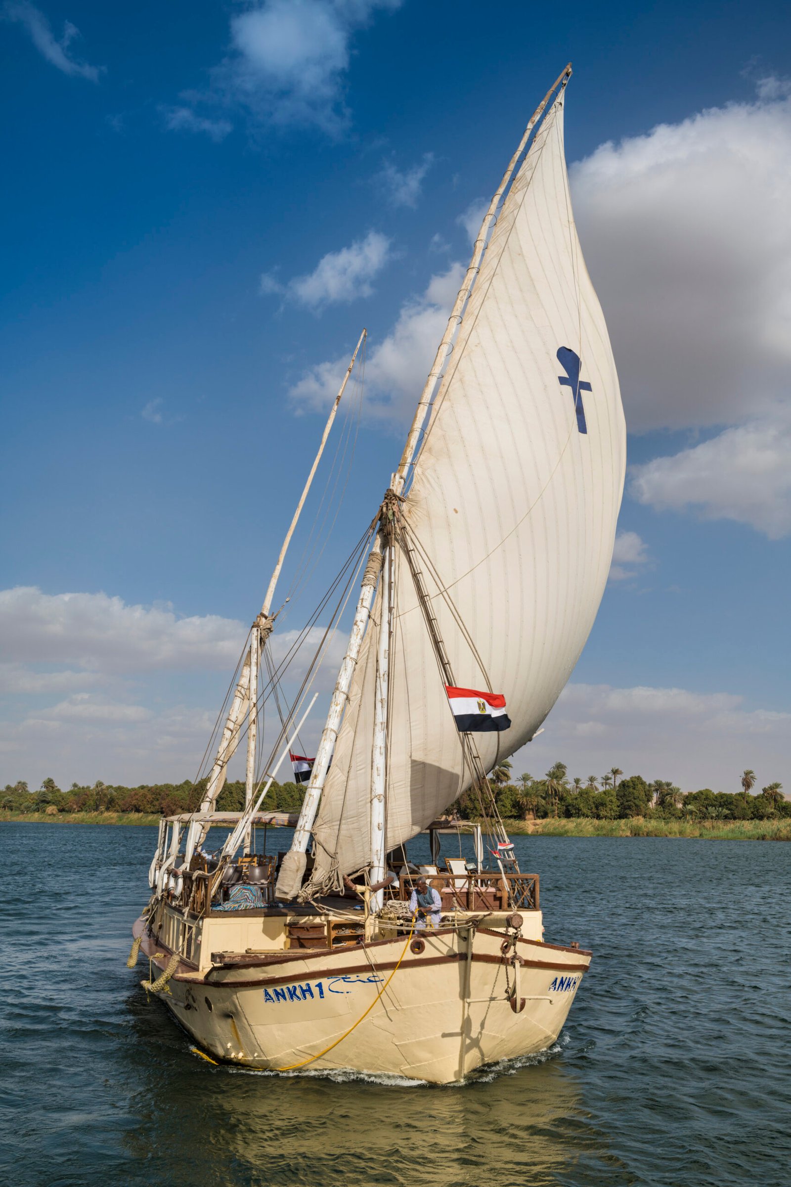 Egypte, Haute-Egypte, vallée du Nil, Esna, le dahabieh Ankh1 naviguant sur le Nil entre louxor et Assouan//Egypt, Upper Egypt, Nile valley, Esna, the Ankh1 dahabieh...