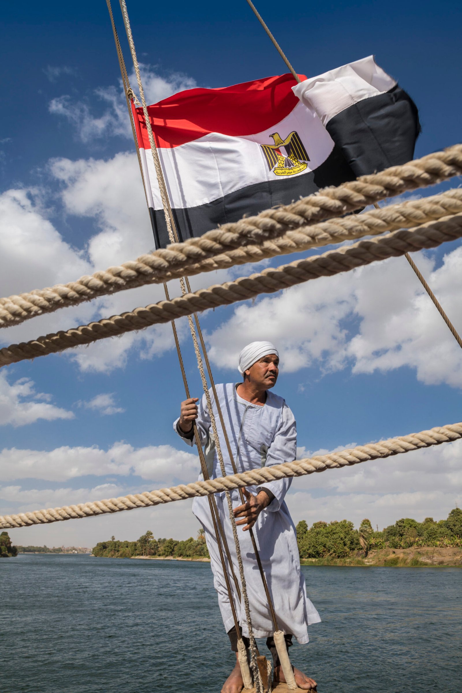 Cairo to Aswan11 Days / 10 nights Egypte, Haute-Egypte, vallée du Nil, Esna, équipage manœuvrant un dahabieh sur le Nil entre Luxor et Assouan//Egypt, Upper...